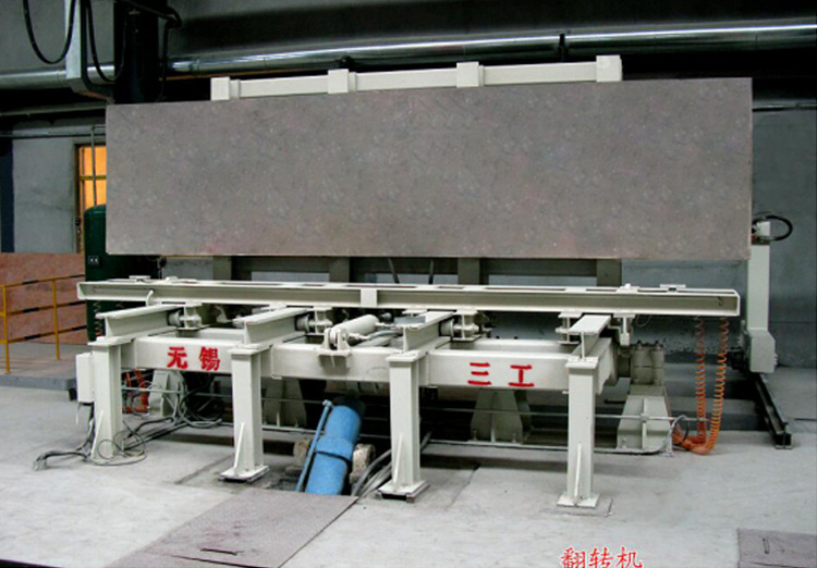 加氣磚成套生產(chǎn)線中用到的一種翻轉(zhuǎn)設(shè)備,翻轉(zhuǎn)臺,主要是加氣線里面,切割完成后,坯體經(jīng)由翻轉(zhuǎn)臺90度翻轉(zhuǎn),再刮廢料機(jī)刮除坯體頂部和底部的廢料。